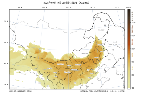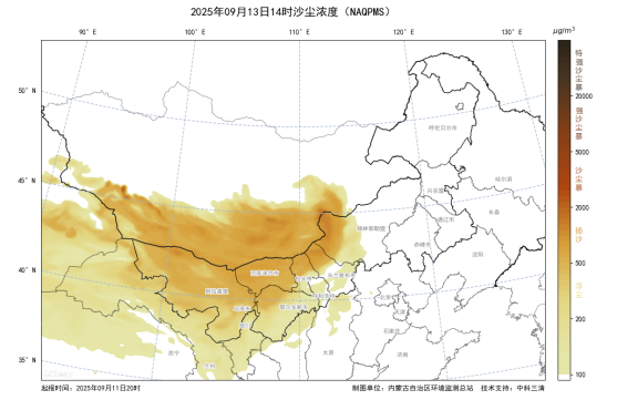 受蒙古气旋影响,9月13日上午开始蒙古国中南部及内蒙古中西部偏北沙源地受大风影响将形成沙尘气团,午后至夜间沙尘气团南下影响阿拉善盟、巴彦淖尔市、乌海市、包头市北部、锡林郭勒盟和乌兰察布市北部,PM10小时浓度峰值可达500-800微克/立方米,日均以良-轻度污染为主,巴彦淖尔市、乌海市、锡林郭勒盟短时可能达到重度污染。14日蒙古气旋东移,我区锡林郭勒盟、赤峰市、通辽市可能持续受到沙尘影响,空气质量日均以良-轻度污染为主,短时可能达到中度及以上污染。14日夜间至15日凌晨,沙尘过程对我区影响基本结束。