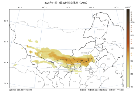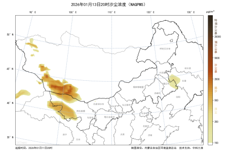 1月13日午后到夜间,蒙古国南部及内蒙古西北部出现10级左右大风,形成较强沙尘气团向东移动,阿拉善右旗、额济纳旗空气质量将达到严重污染, PM10小时浓度峰值可达1000微克/立方米以上。