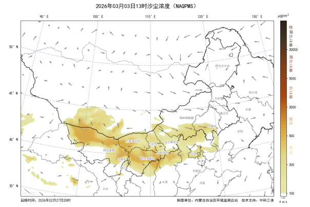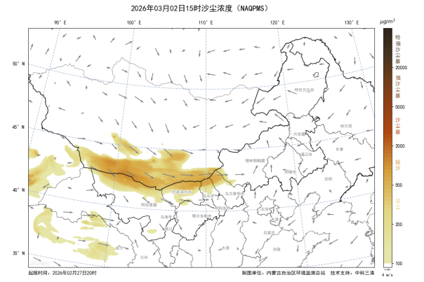 3月2日午后,蒙古国南戈壁省及我区西北部地区出现十级大风天气,将产生一股较强沙尘气团,巴彦淖尔市、阿拉善盟、乌海市、包头市、呼和浩特市、乌兰察布市、锡林郭勒盟、鄂尔多斯市等盟市逐步受到沙尘影响,其中巴彦淖尔市受影响较重,PM10小时浓度峰值预计超过1000微克/立方米,上述盟市空气质量日均为轻度-中度污染。