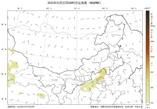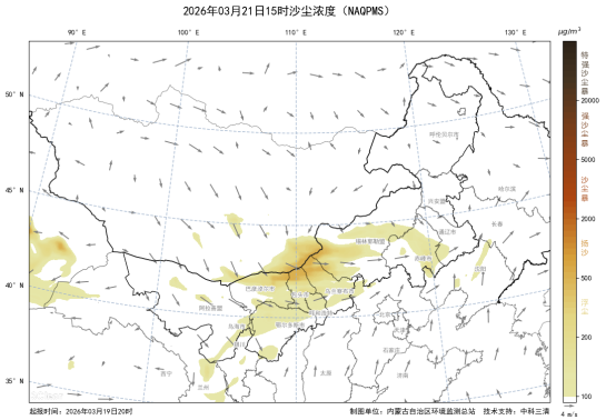 3月21日下午,蒙古国南部及我区阿拉善北部和阴山以北地区出现十级左右大风,将形成一股中等强度沙尘气团,并南下影响我区巴彦淖尔市、乌海市、鄂尔多斯市、包头市和呼和浩特市,以上盟市PM10小时浓度峰值预计超过600微克/立方米,21日和22日空气质量日均以轻度污染为主。