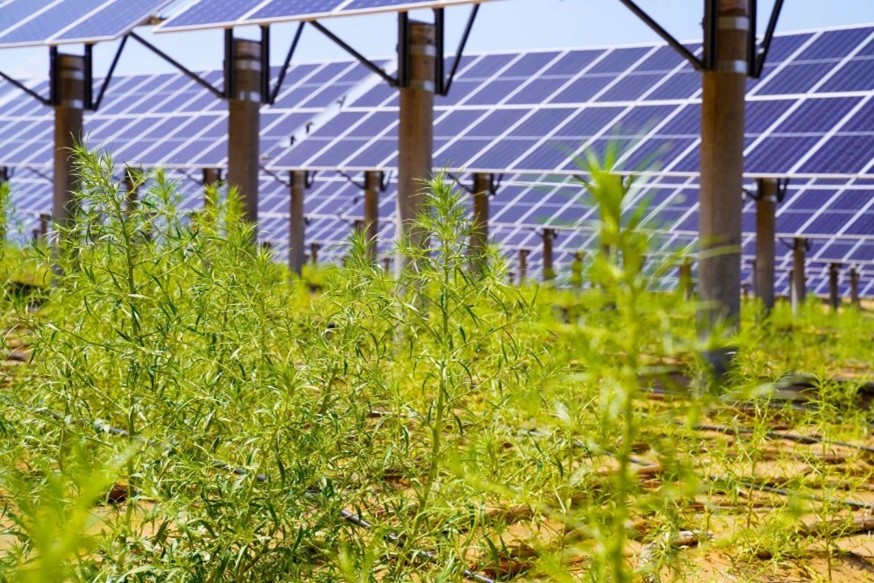 为加快推进项目建设,突出示范带动作用,先行开展100万千瓦光伏+荒漠化治理先导工程建设。每年可节约标煤60.76万吨,减少二氧化碳排放量约为166.86万吨。先导工程建设项目位于达拉特旗县城西南侧约34公里处,场区面积约3.25万亩,均为半流动性沙漠,采用“光伏+生态治理”建设模式,以高效、生态、循环为前提,实现板上发电,板间、板下统筹兼顾特色生态修复、经济作物、造林绿化与技术创新,打造“三级防护”“一地多用”立体生态修复模式。