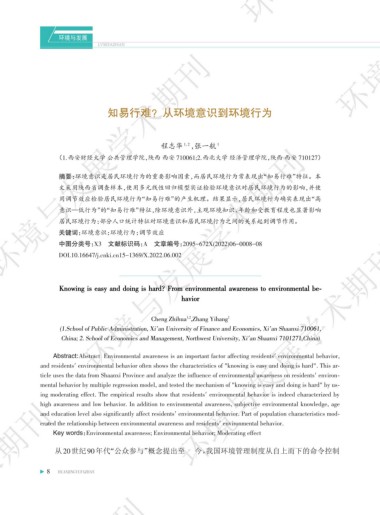 摘要:环境意识是居民环境行为的重要影响因素,而居民环境行为常表现出“知易行难”特征。本