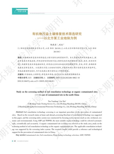 screening method of soil remediation technology at the organic contaminated site. The applicable remediation technol⁃