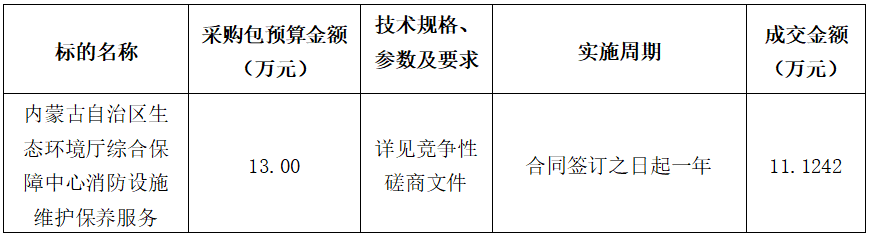 内蒙古自治区生态环境厅综合保障中心于2025年4月28日就内蒙古自治区生态环境厅综合保障中心消防设施维护保养服务(项目编号:BZZX-2025-010)采用竞争性磋商方式进行采购。现就本次采购的中标(成交)结果公告如下: