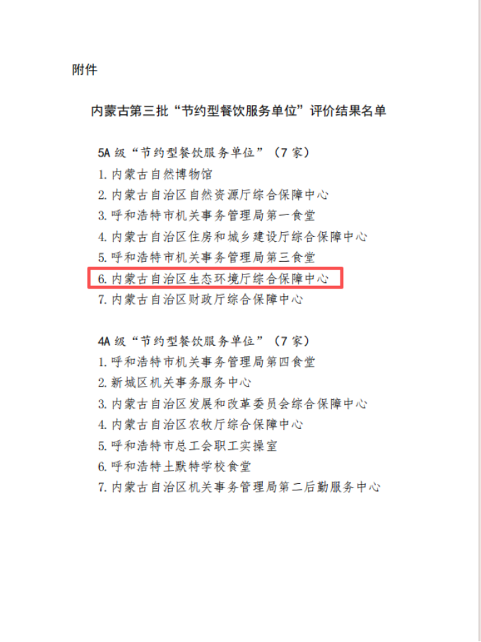 近日,在由内蒙古自治区市场监督管理局指导,内蒙古烹饪餐饮饭店行业协会组织的第三批“节约型餐饮服务单位”评价活动中,自治区生态环境厅综合保障中心成功获评5A级“节约型餐饮服务单位”。